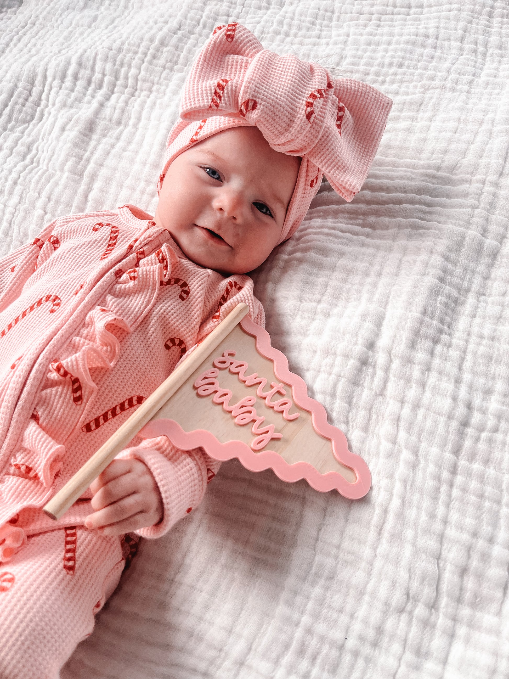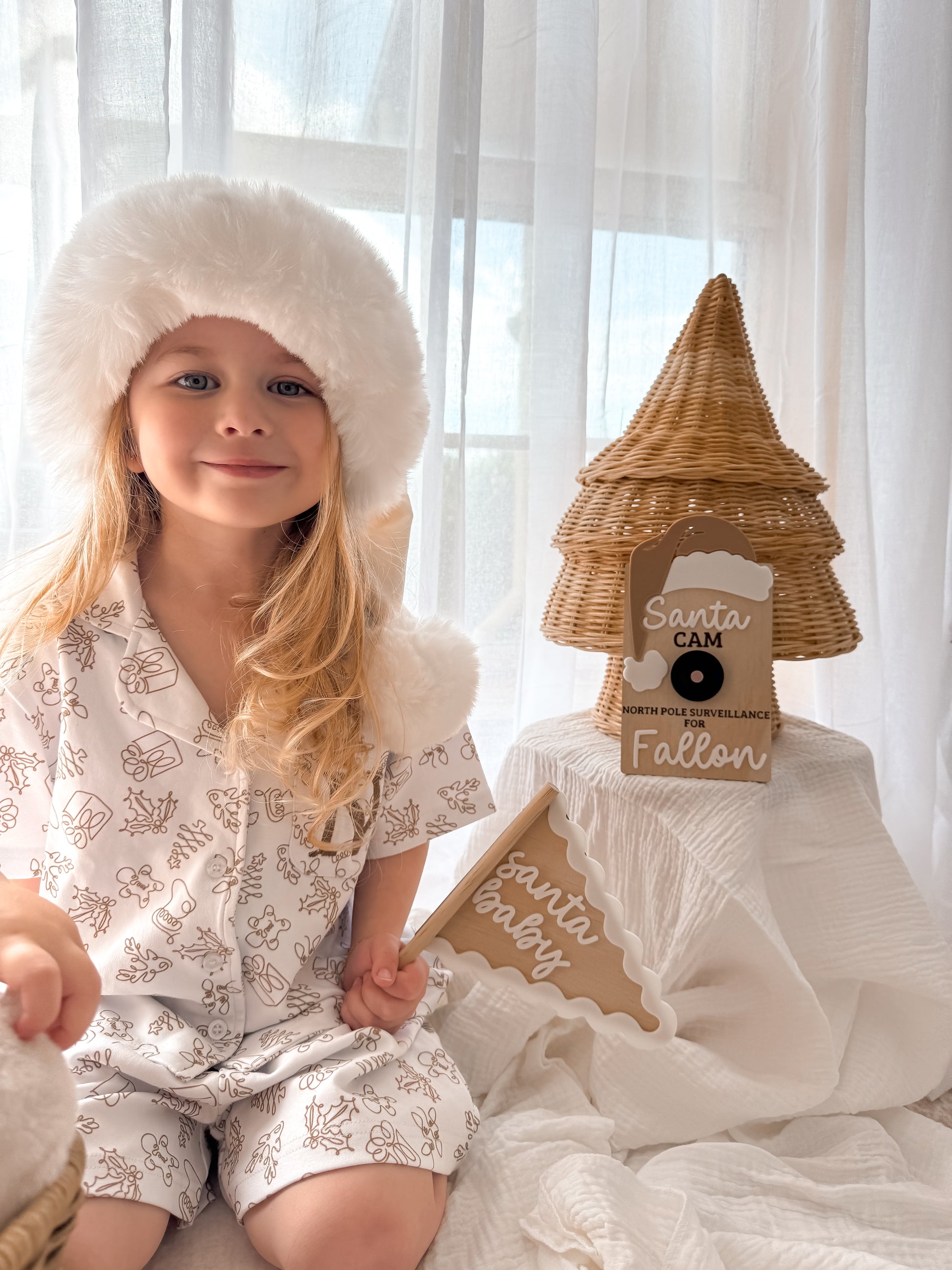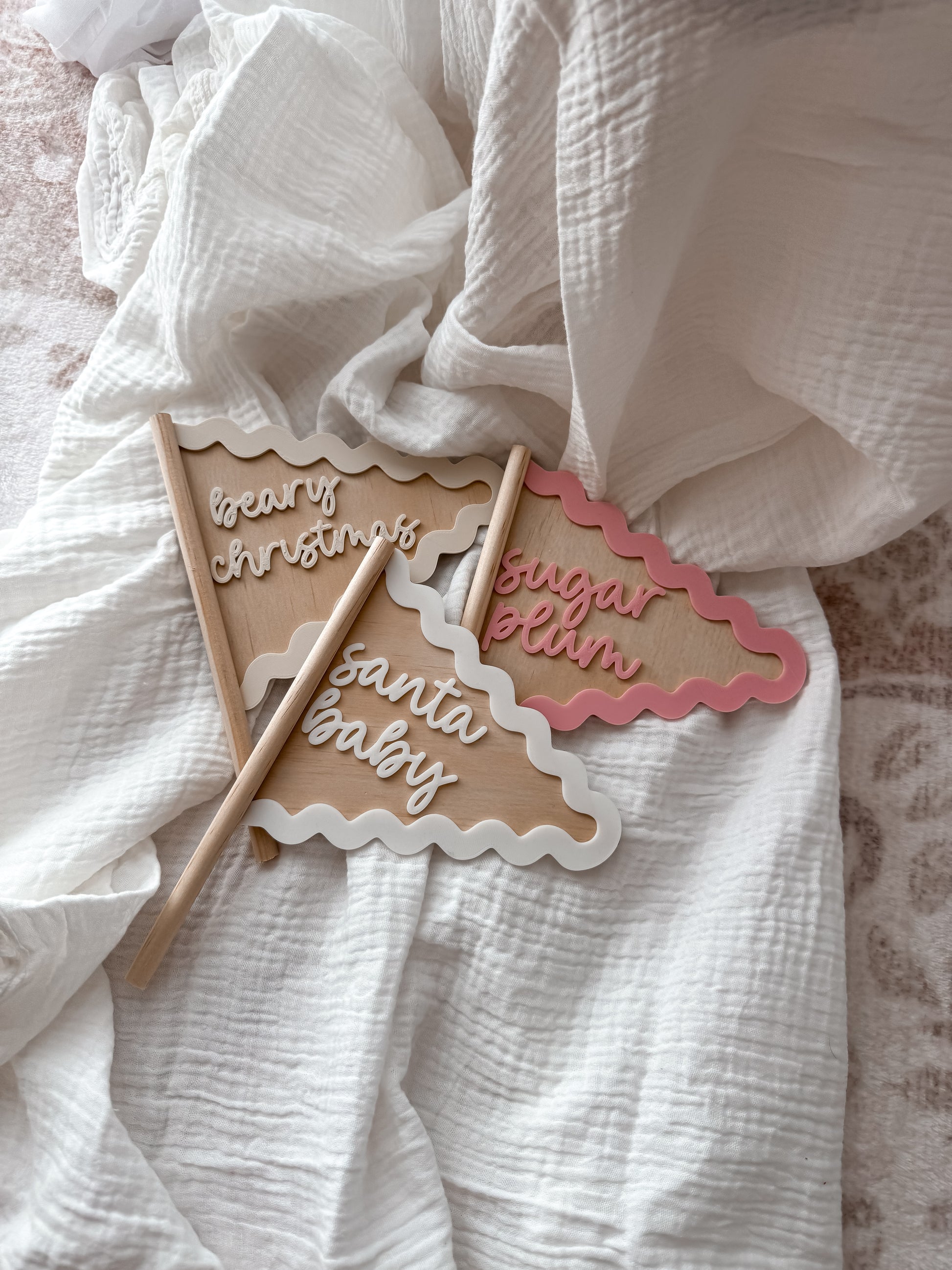 Crafted on a natural wooden flag and finished with a playful wavy 3D-printed edge and raised wording, these pieces are both timeless and fun. Choose from festive phrases like Santa Baby, Sugar Plum, or Beary Christmas to capture the magic of the season.